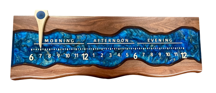 - Surface river: Resin-filled 1/2" deep valley on the clock face, lettering carved and resin-filled above the river.