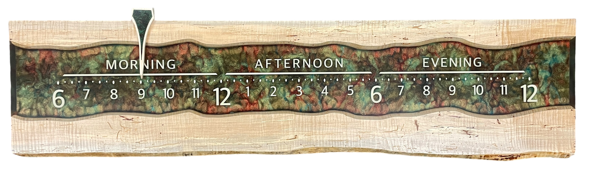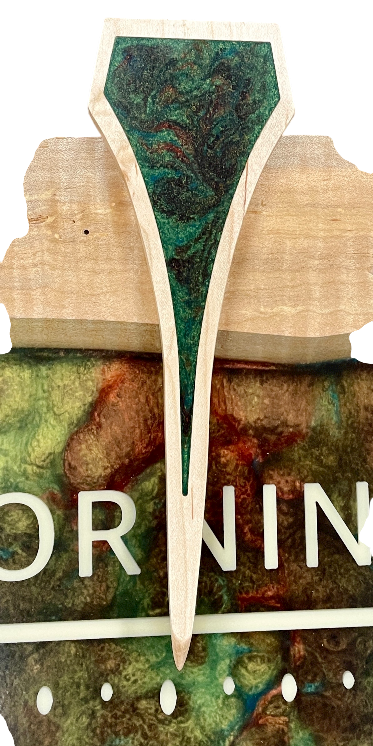Alain is a nicely spalted length of rock maple with a natural lower edge. We poured in a resin river swirled in green and copper, then embedded cream-colored lettering in the river. The letters seem to float in midair.