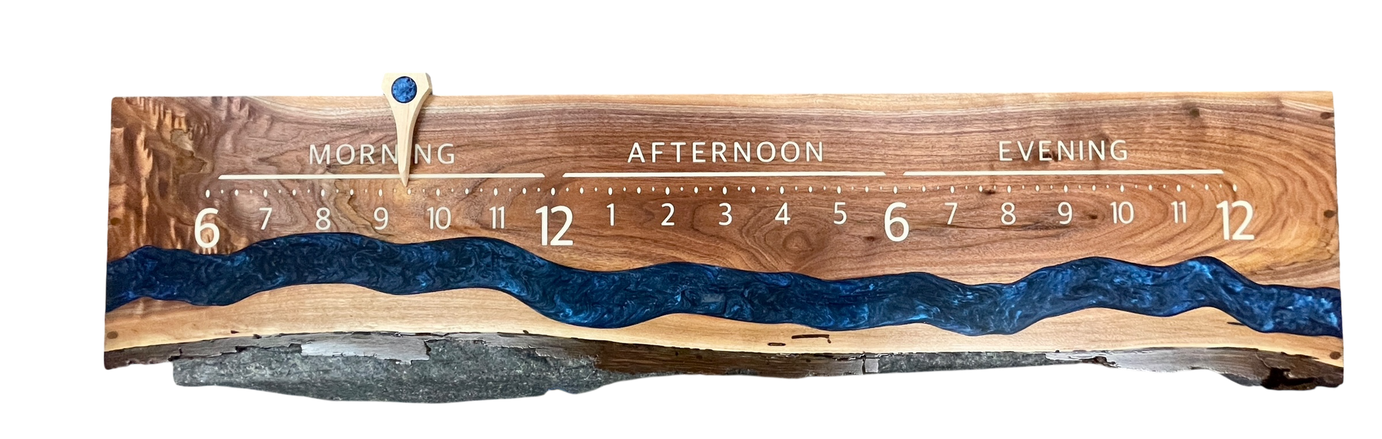Cream-colored resin inlays mark the hours with clarity and contrast. The maple time pointer echoes the shape and color of the resin river, tying the design together beautifully.