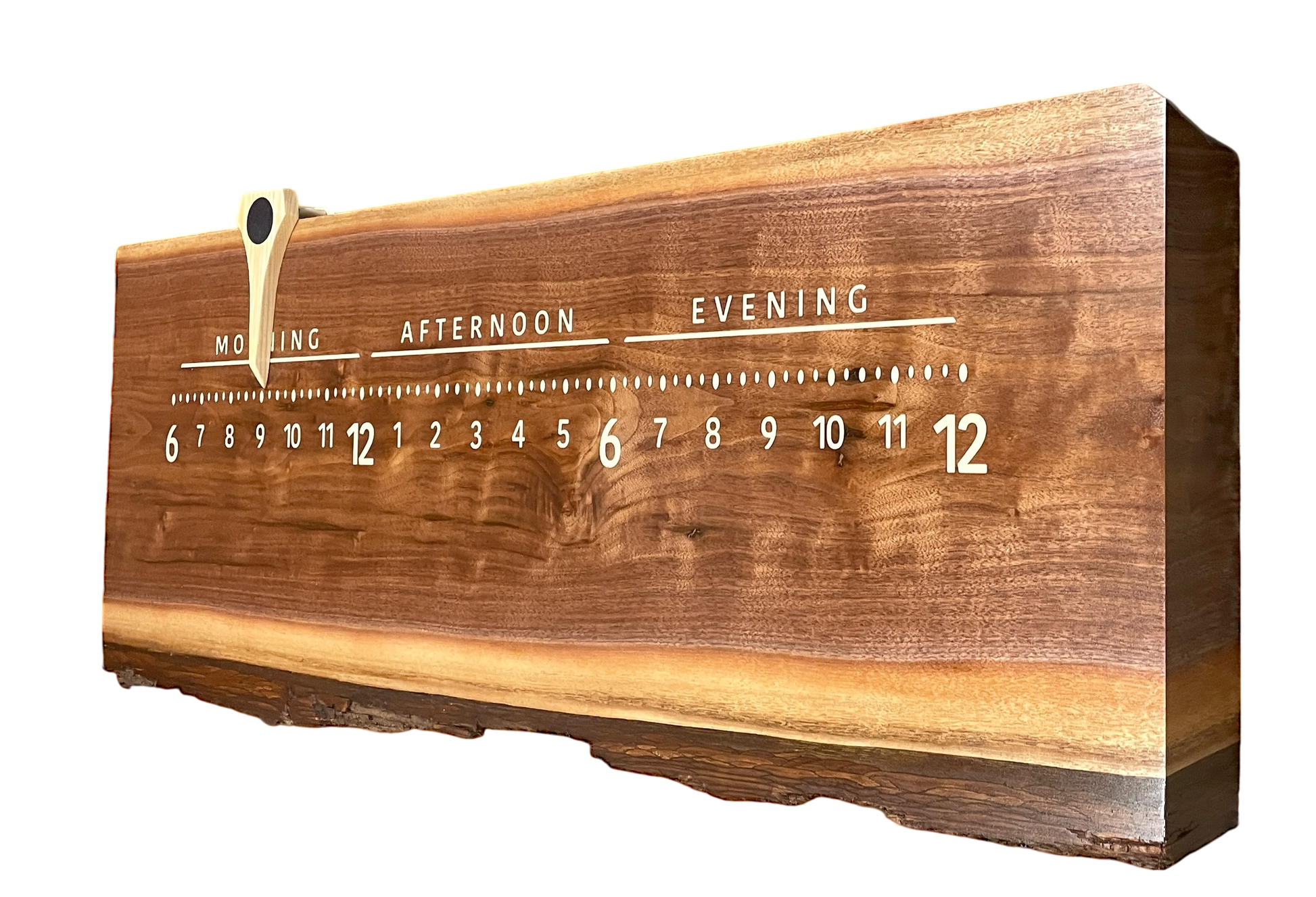 Reggie is our classic black walnut clock: sturdy, handsome, and large enough to make a big statement on your wall! We wrapped the grain around the corners perfectly for that waterfall effect woodworkers admire. The full length bark lower edge is a plus.