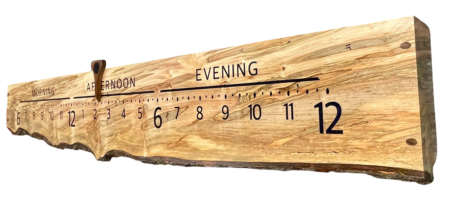 We used jet-black lettering and a dark walnut pointer for easy reading. The pointer's blue resin circle is like a celestial being taking shelter in this tree.