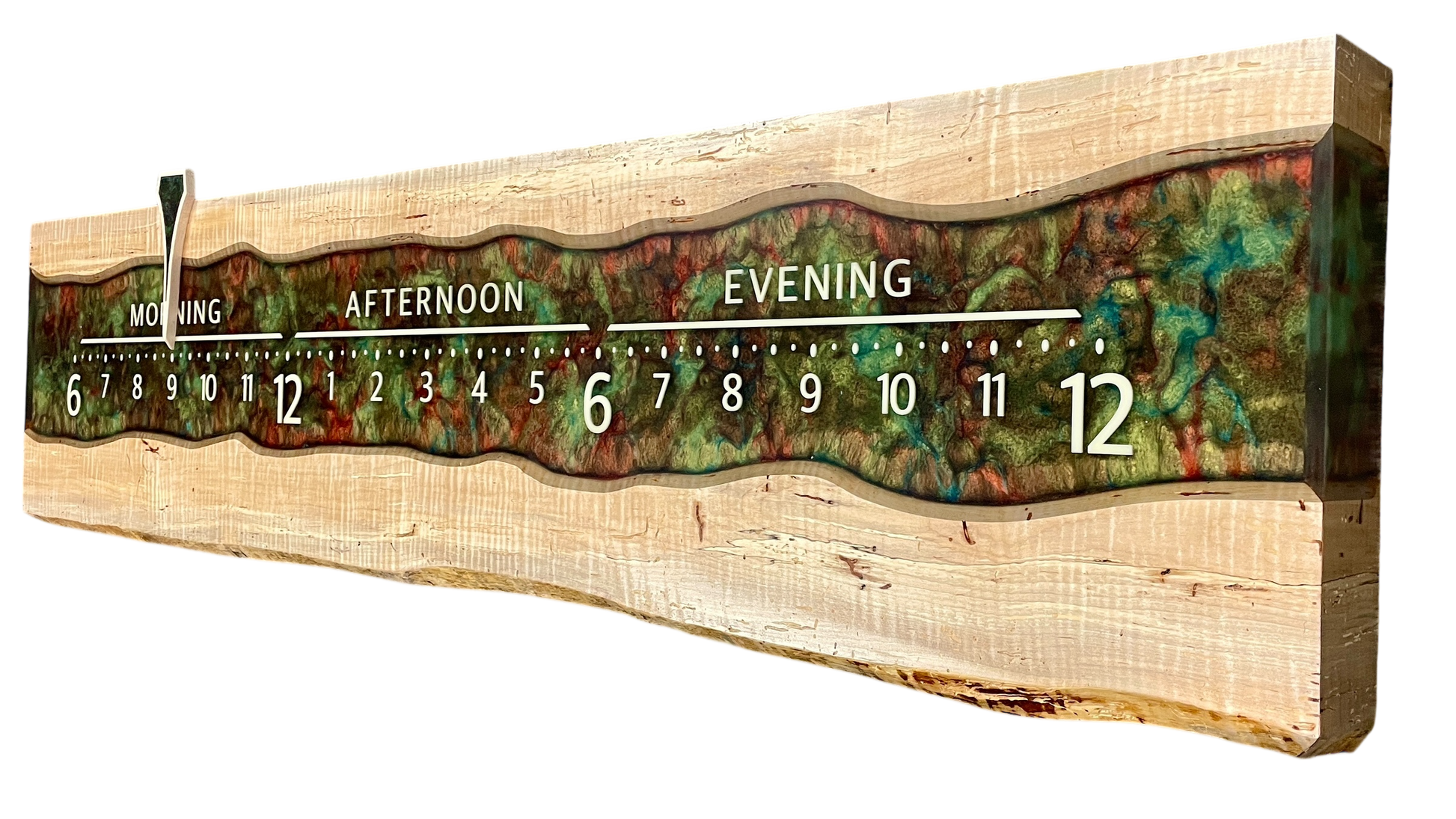 Derwin is a nicely spalted length of rock maple with a natural lower edge. We poured in a resin river swirled in green and copper, then embedded cream-colored lettering in the river. The letters seem to float in midair.