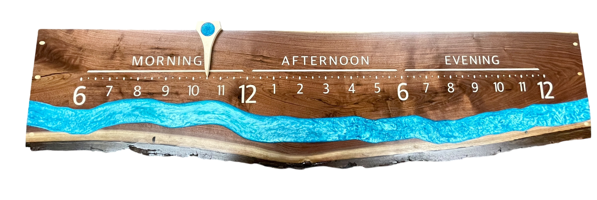 Cream resin inlay marks each hour with contrast and clarity, while the maple pointer floats cleanly above the river’s flow. At 60 inches wide, Dylan is bold enough for modern interiors but calming enough for quiet spaces.