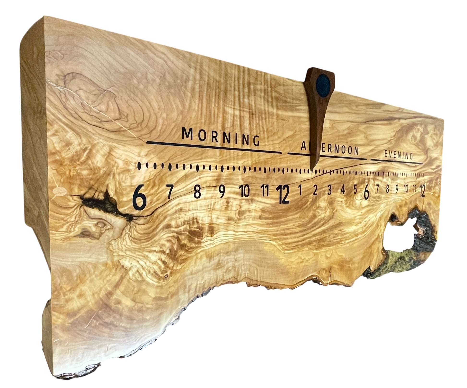 Jet black nlays mark the hours with clarity and pop, while the maple pointer adds warmth and contrast. This is a clock that embraces imperfection and beauty in equal measure — raw, honest, and utterly sculptural.