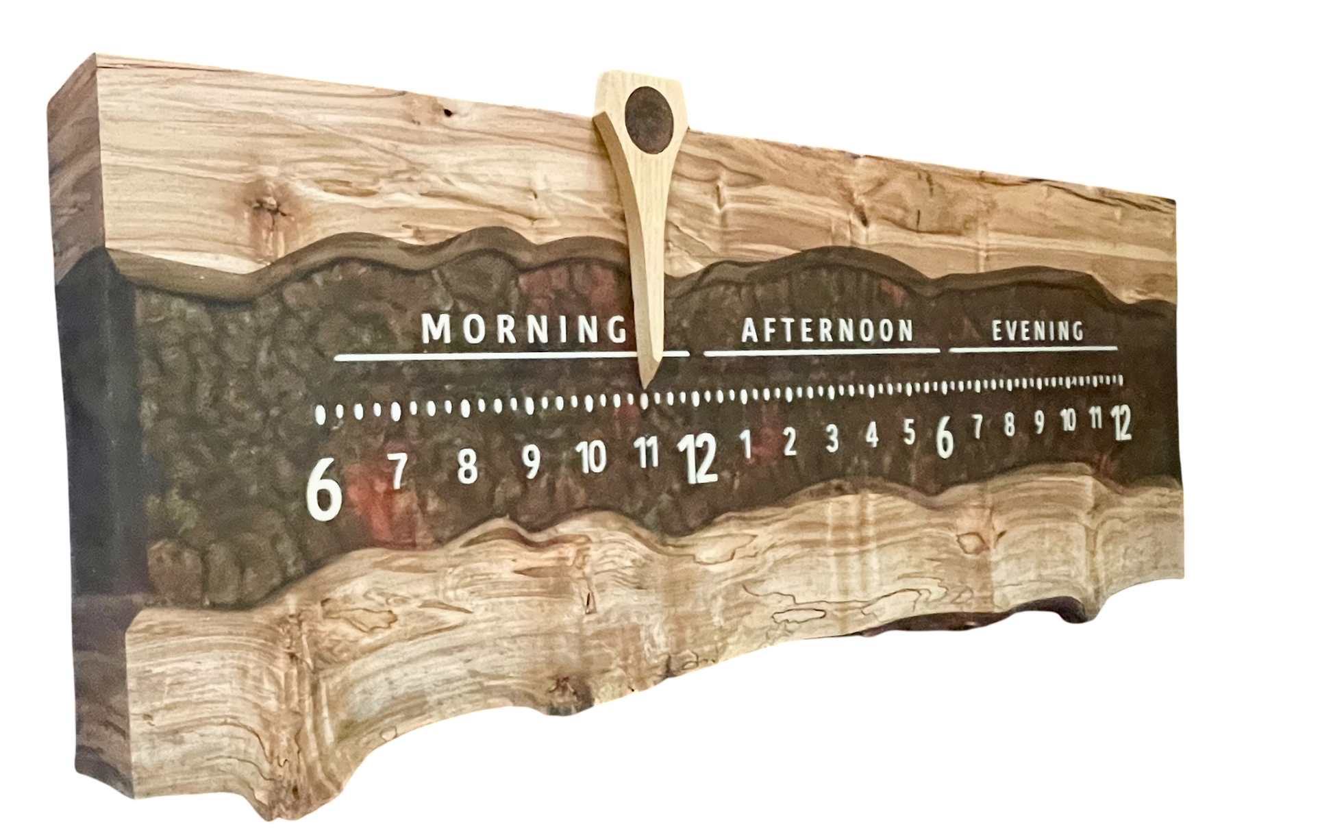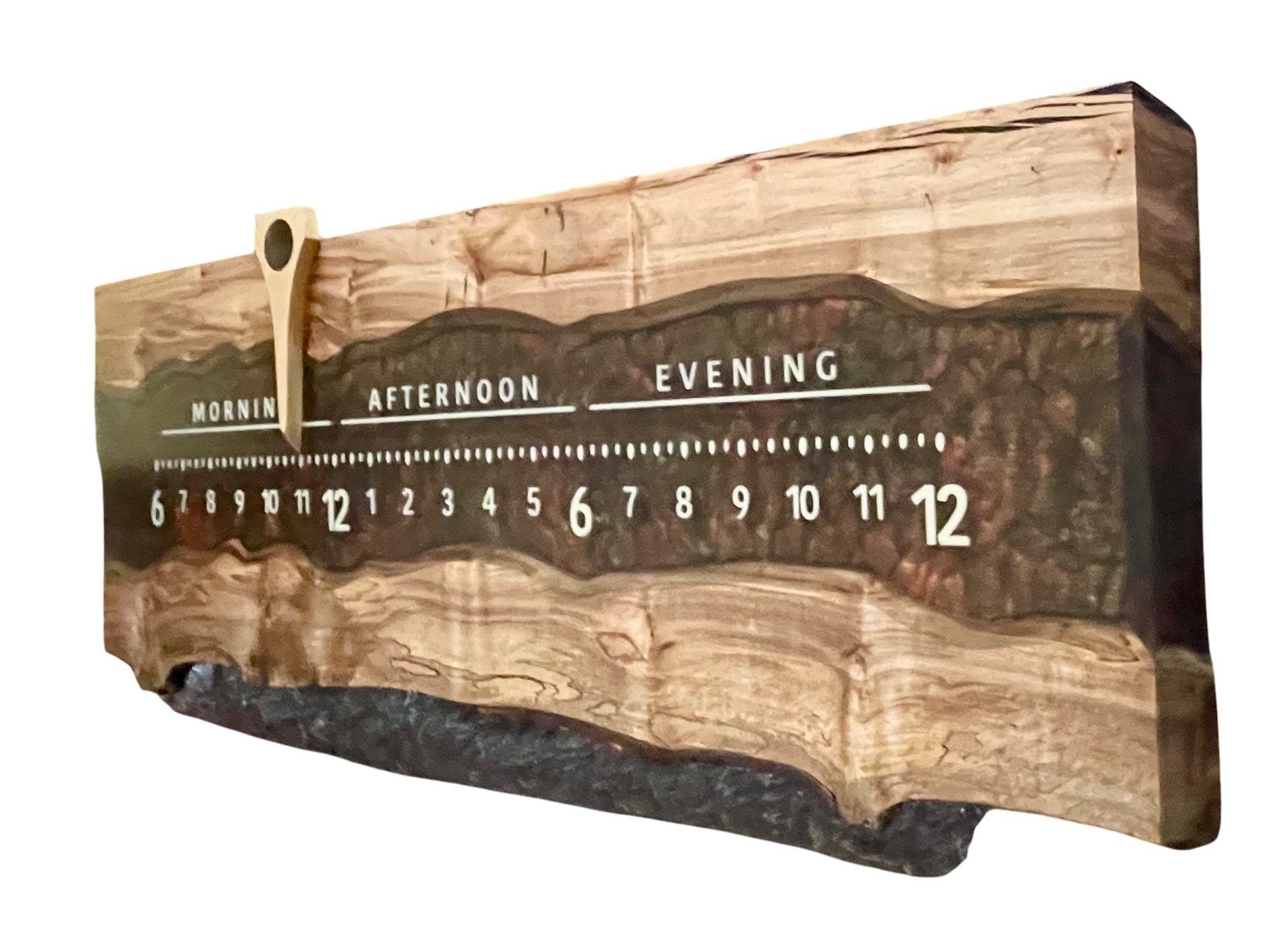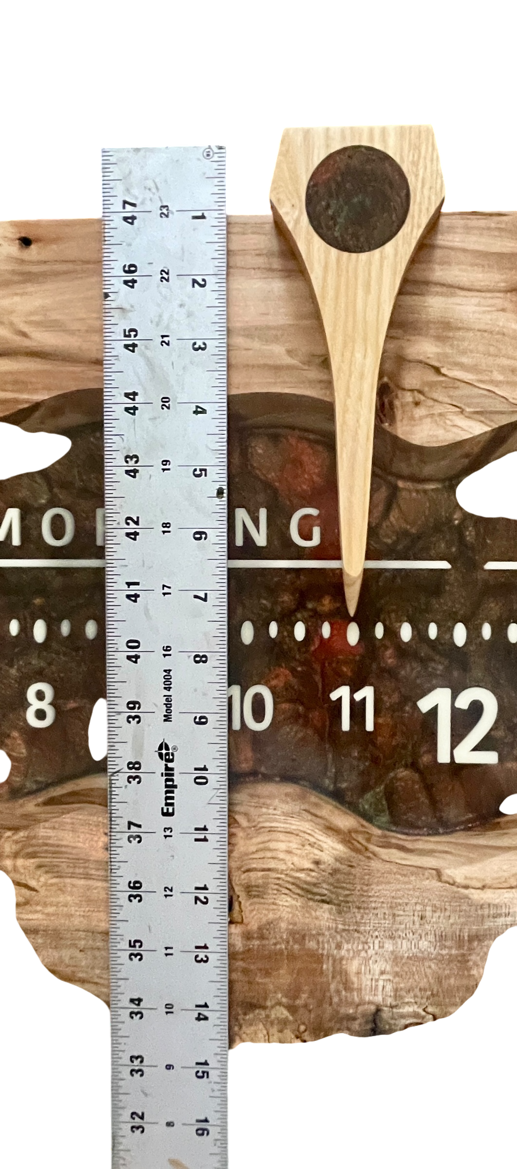 We wrapped the grain perfectly around the corners. The letering magically floats in mid-air above the rich green and copper resin backdrop.