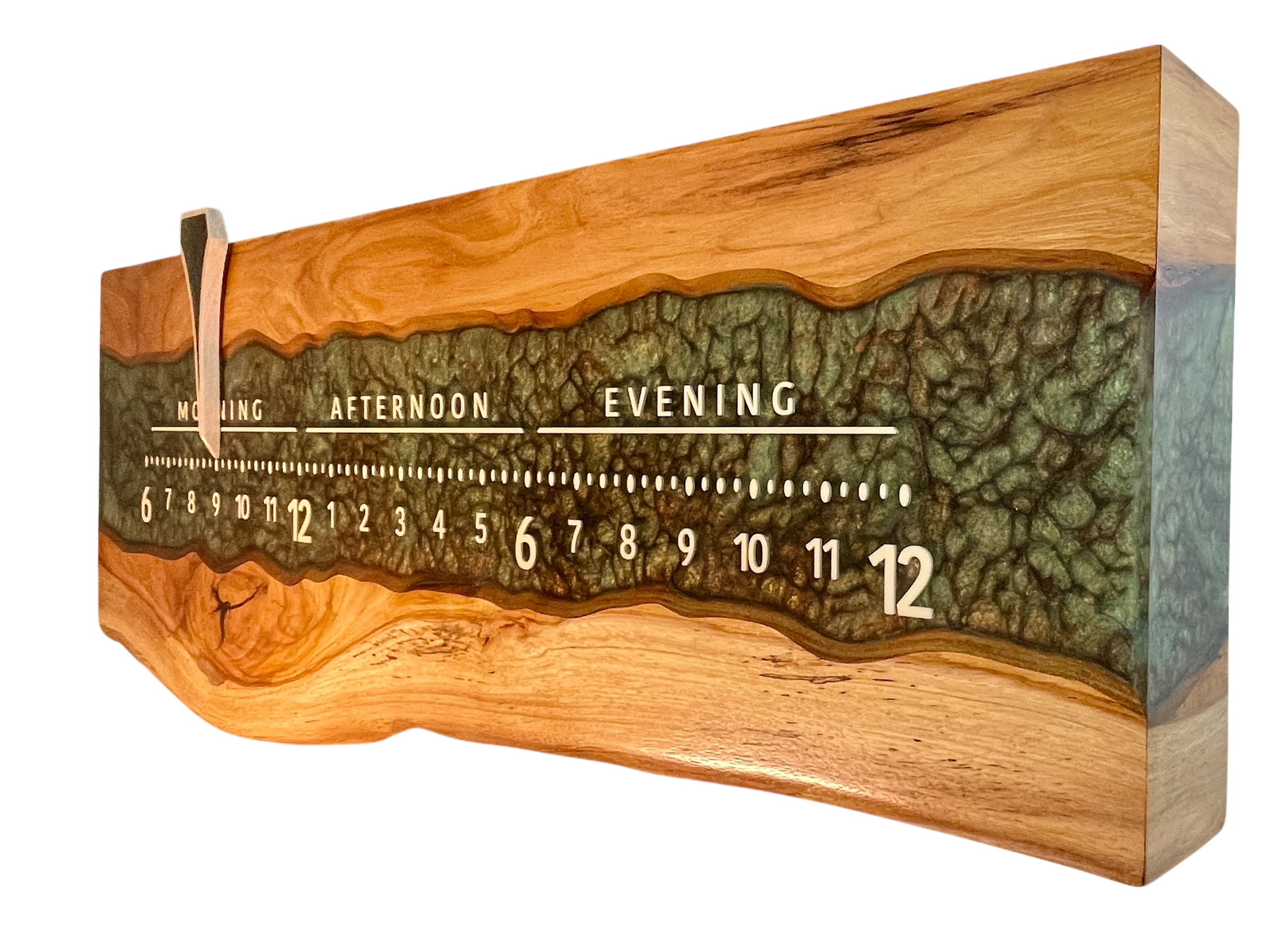 Not content with nature's wild beauty, we added a deep green / copper resin river that floats the lettering in a 3-D space. The contrasting maple pointer is accented with a matching resin diamond.