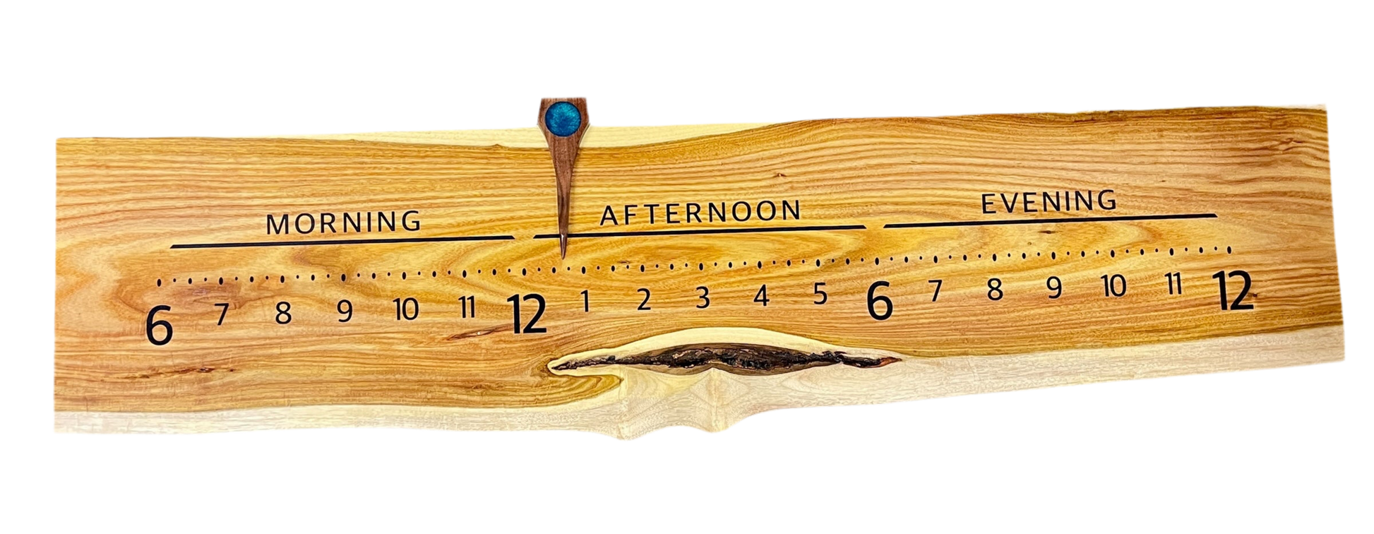 Dark blue resin hour inlays provide clarity without overpowering the wood’s visual rhythm. A dark walnut pointer moves with quiet purpose above it all.