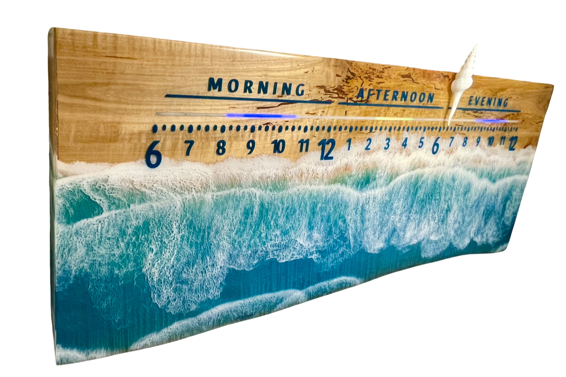 Meridian is a Maple clock with a bright ocean wave that encroaches on the letters, like the surf would do to your feet. The resin-inlaid turquoise lettering finishes this unique clock nicely.