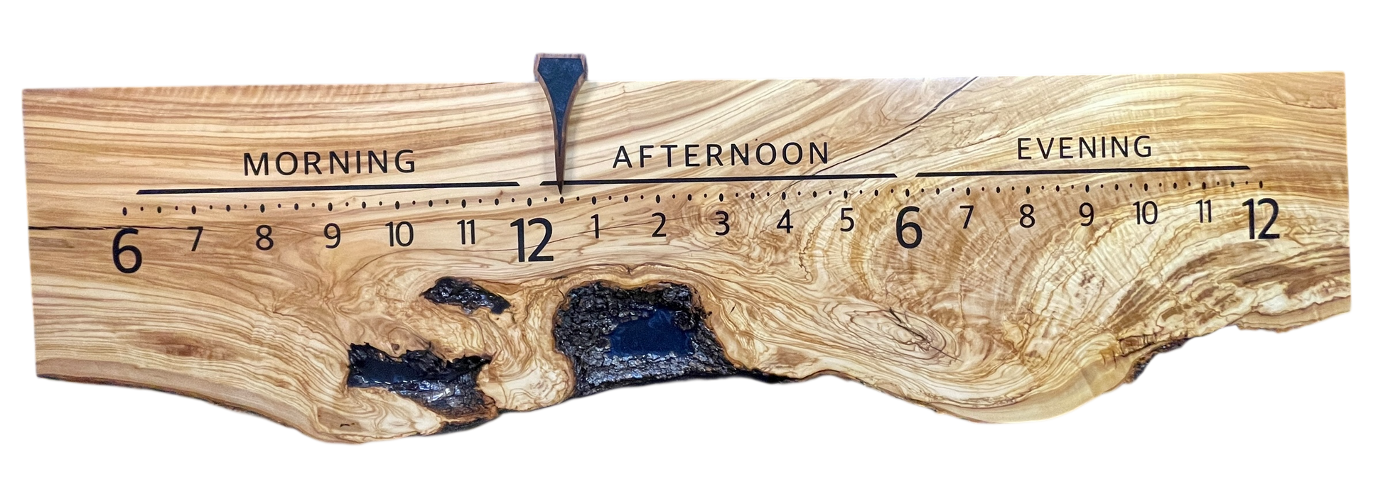 Jet black resin inlays mark the hours with clarity and pop, while the dark walnut pointer adds warmth and contrast. This is a clock that embraces imperfection and beauty in equal measure — raw, honest, and utterly sculptural.