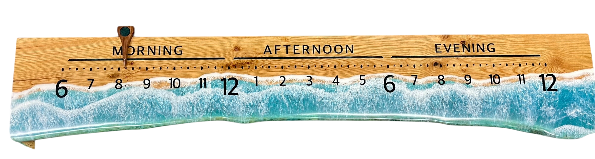 We turned this nice piece of Red Oak into an Ocean-themed piece. Tonga's resin ocean is accented with white foam (also resin) swirled in with air. We love the way the ocean encroaches on the lettering, like it would on your feet on the beach.